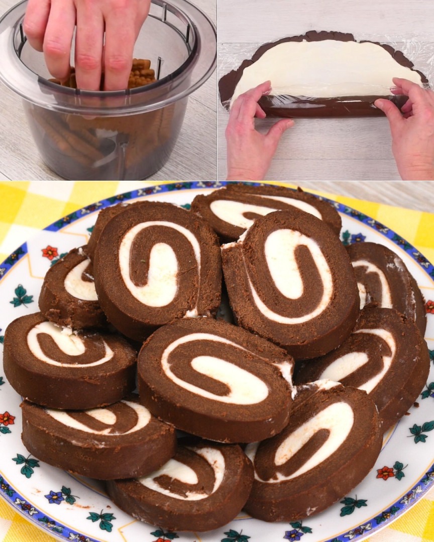 Za pomocą papieru do pieczenia delikatnie unieś bułkę i zwiń ją samodzielnie. Roladę zawiń w papier do pieczenia i włóż do lodówki na co najmniej 2 godziny, a najlepiej na całą noc. Dzięki temu bułka stanie się stabilna i łatwa do pokrojenia.