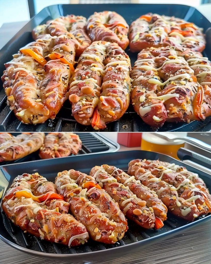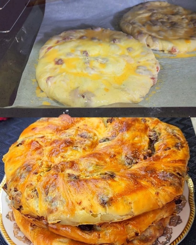 Składniki :250 ml wody250 ml mleka1 łyżeczka soli800 g mąki uniwersalnej1 łyżeczka proszku do pieczenia3 cebule, drobno posiekane400 g mięsa mielonego (do wyboru)Sól i przyprawy do smaku150 g roztopionego masła1