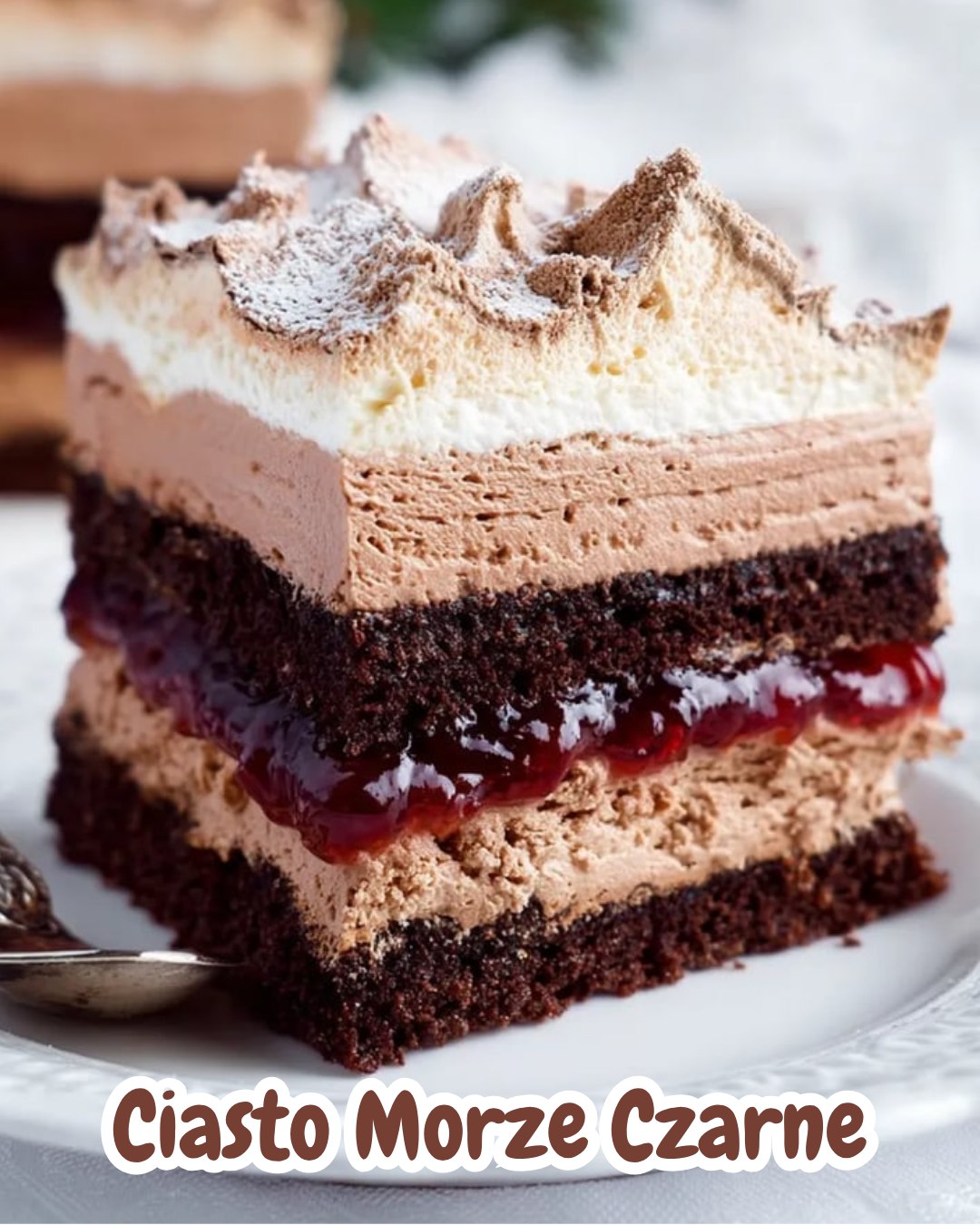 Jeśli szukasz deseru, który wygląda jak dzieło sztuki, a smakuje jeszcze lepiej, niż wygląda – ciasto „Morze Czarne” to właśnie taki przepis. To połączenie ciemnego biszkoptu kakaowego, puszystej bezy i kremowego nadzienia z mascarpone, które zachwyci zarówno pod względem smaku, jak i prezentacji.