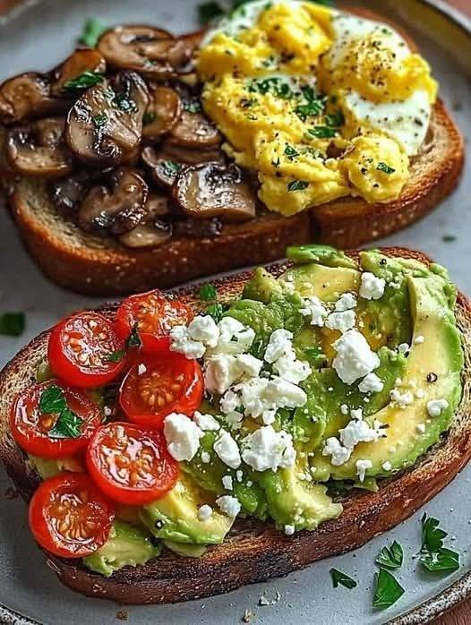 Ulepsz swoje śniadanie tym przepysznym tostem z awokado z czterema aromatycznymi dodatkami: soczystymi pomidorkami koktajlowymi, kremową fetą, puszystą jajecznicą i pikantnymi pieczarkami z czosnkiem. Idealny na pożywny i sycący posiłek!