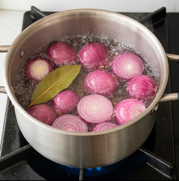 Dodaj cebulę wraz ze skórką i liściem laurowym.
