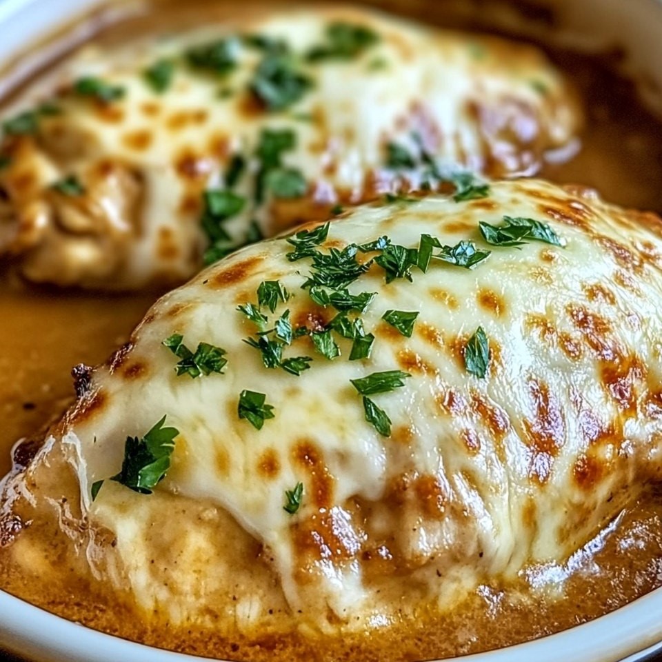 Podczas ostatnich 15 minut pieczenia równomiernie posyp kurczaka mozzarellą i parmezanem. Przykryj i pozwól, aby ser się roztopił.