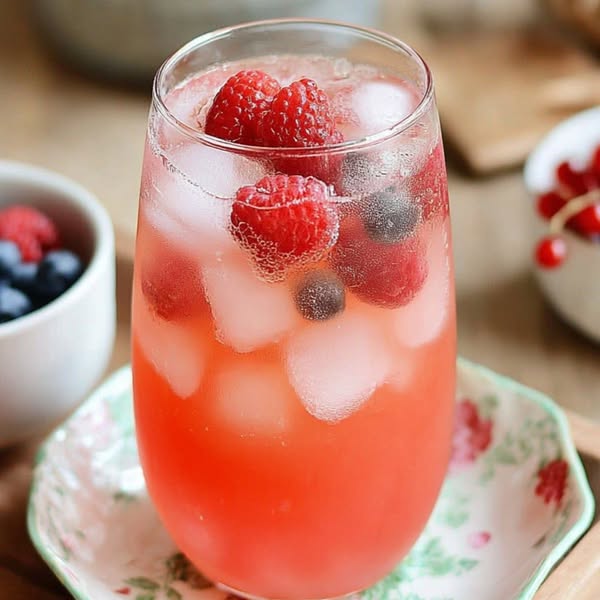 Delikatnie włóż do każdej szklanki 3 maliny, 3 borówki i 1 lub 2 porzeczki. Jagody powinny być ułożone pomiędzy kostkami lodu, aby uzyskać efekt wizualny.