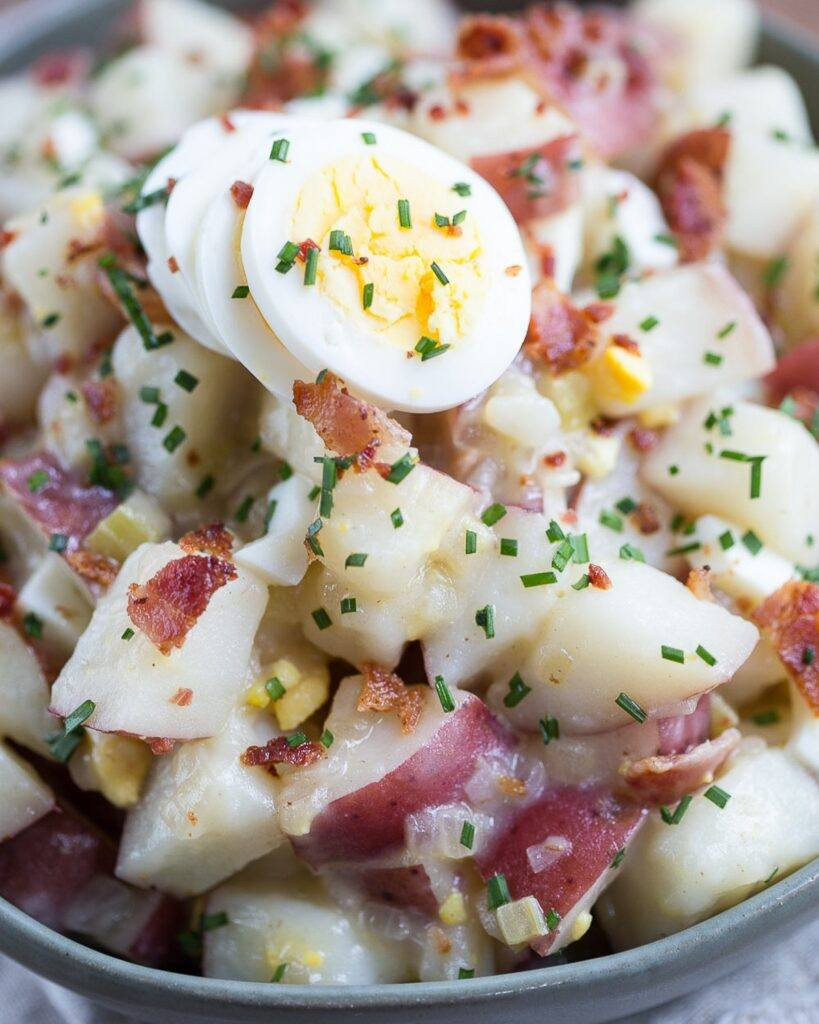W przeciwieństwie do tradycyjnej sałatki ziemniaczanej , te ziemniaki są pokryte słodko-kwaśną mieszanką białego octu winnego, cukru, suchej musztardy i… skwarków z boczku. Naprawdę! To właśnie sprawia, że są takie pyszne.