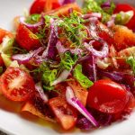 Ta sałatka ze świeżych pomidorów, zwieńczona aromatycznym dressingiem z parmezanu, cytryny i octu jabłkowego, stanowi wspaniały dodatek do lunchu lub kolacji, a także można ją podawać jako lekką letnią ucztę.