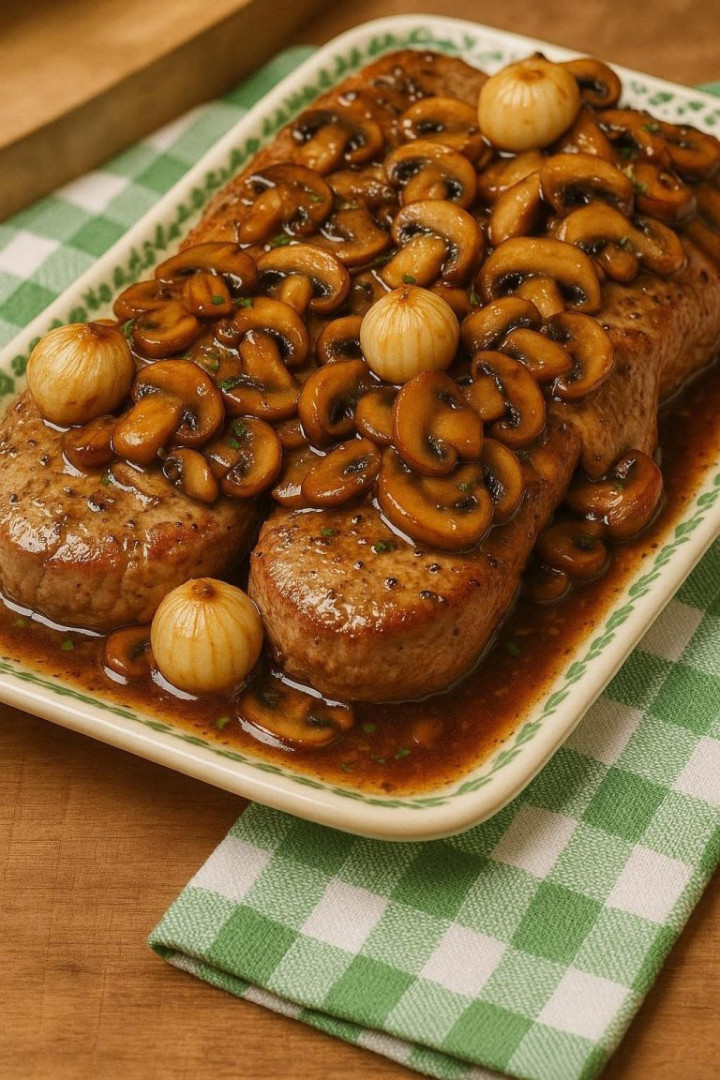 • 1 polędwica wieprzowa • 10 ząbków czosnku • 300 g pieczarek • 200 ml białego wina • Posiekana natka pietruszki • Oliwa z oliwek do smaku • 7/8 małej cebuli • Sól i pieprz do smaku Przygotowanie: Dokładnie oczyść pieczarki, aby usunąć wszelkie ślady ziemi. Pokrój pieczarki w grube plastry i odłóż na bok. Pokrój polędwicę w medaliony o grubości około 2 cm. Dopraw solą i pieprzem do smaku. Zmiażdż ząbki czosnku nożem, (Można użyć ze skórką, aby wzmocnić smak. Rozgrzej oliwę z oliwek na dużej patelni na dużym ogniu. Smaż czosnek i cebulę na złoty kolor.