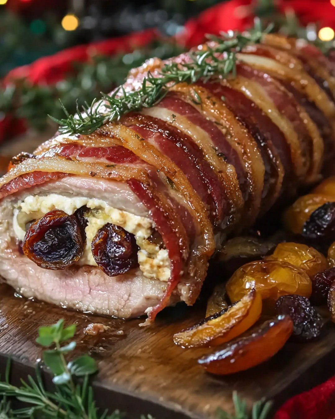 Ułóż pokrojone śliwki, ser brie i boczek na rozłożonej polędwiczce wieprzowej. Zwiń polędwiczkę i zwiąż ją sznurkiem kuchennym, upewniając się, że jest dobrze zabezpieczona.