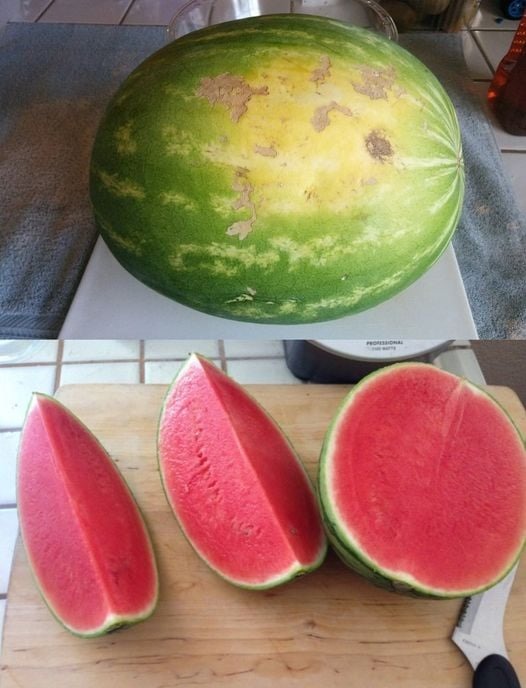 To tutaj melon leżał na ziemi i dojrzewał w słońcu. Intensywna, złocistożółta lub pomarańczowa plama zazwyczaj wskazuje, że arbuz zdążył w pełni dojrzeć i rozwinąć słodki smak. Jeśli plama jest słaba lub niewidoczna, prawdopodobnie oznacza to, że owoc został zebrany zbyt wcześnie i może nie być zbyt słodki.