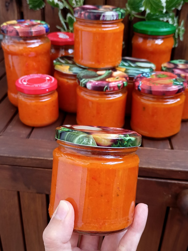 Taką pastę podaję na zimno zwłaszcza do kanapek, wędlin, mięs z grilla, ale także jako dodatek do ryżu, makaronu, a nawet zup, sosów lub farszów. Warto przygotować na zimę kilka słoiczków, bo na pewno się przdadzą. Przygotowanie takiej pasty nie jest pracochłonne, bo w zasadzie wszystkie warzywa przepuszczamy przez maszynkę😉. Gdy warzyw w ogródku pełno, taka pasta jest świetnym sposobem na to, by nic się nie zmarnowało😉. Z przepisu wyszła mi dość spora porcja: 10 słoiczków po 200 ml i 4 słoiki po 370 ml.