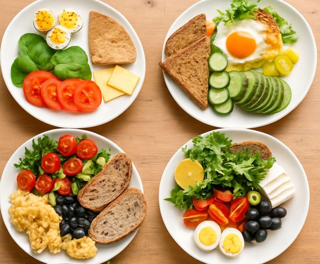 Ugotuj jajka na twardo i przekrój na połówki. Na talerzu ułóż sałatę, pomidorki, ser, winogrona, oliwkę, jajka i chleb. Dodaj kawałek cytryny do dekoracji i smaku.