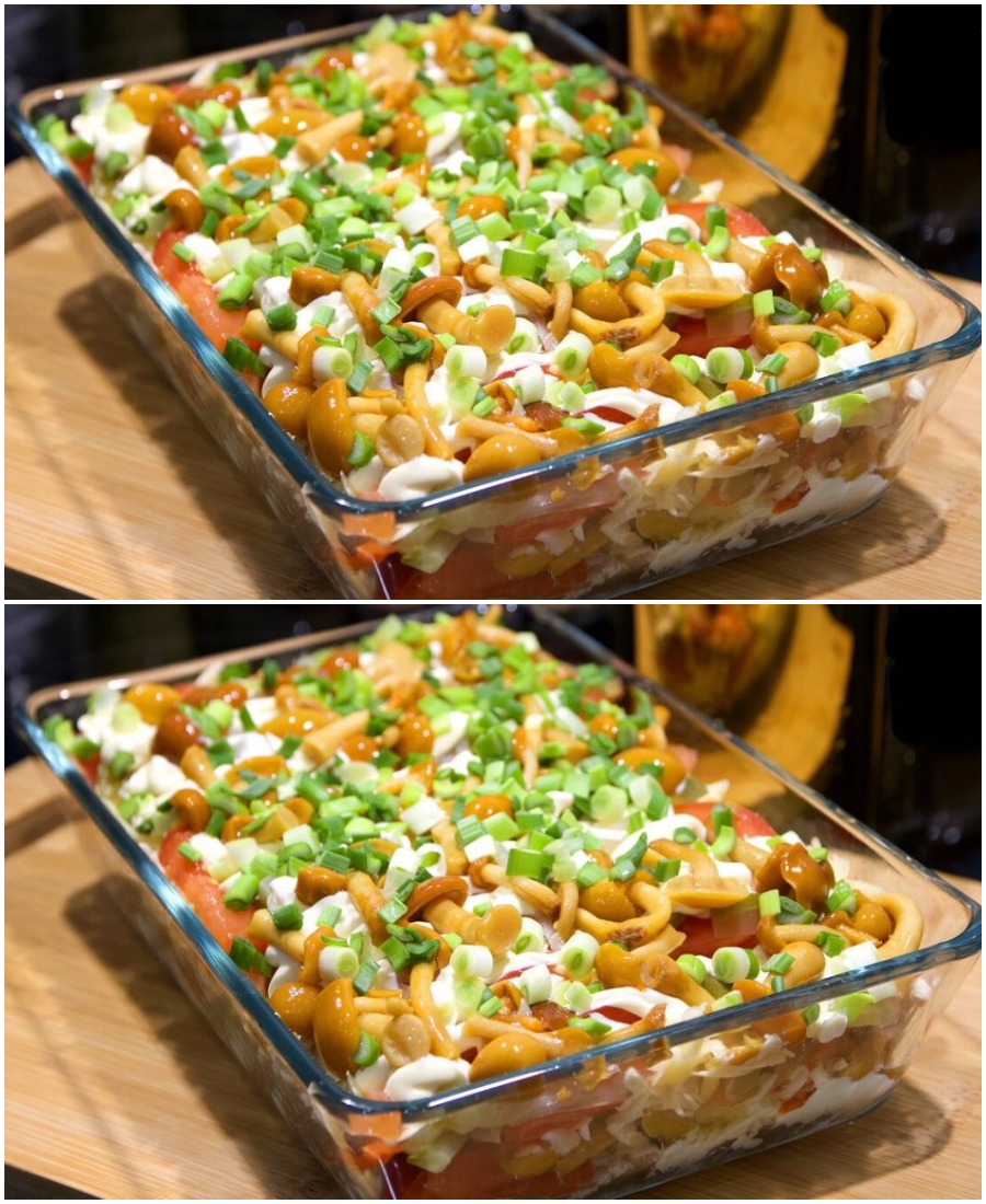 Twoja sałatka „Caprice”, z mieszanką kurczaka, sera, warzyw i pieczarek, przełożona majonezem, brzmi jak wspaniały dodatek do każdej świątecznej okazji. Oto przepis oparty na Twoich wskazówkach: