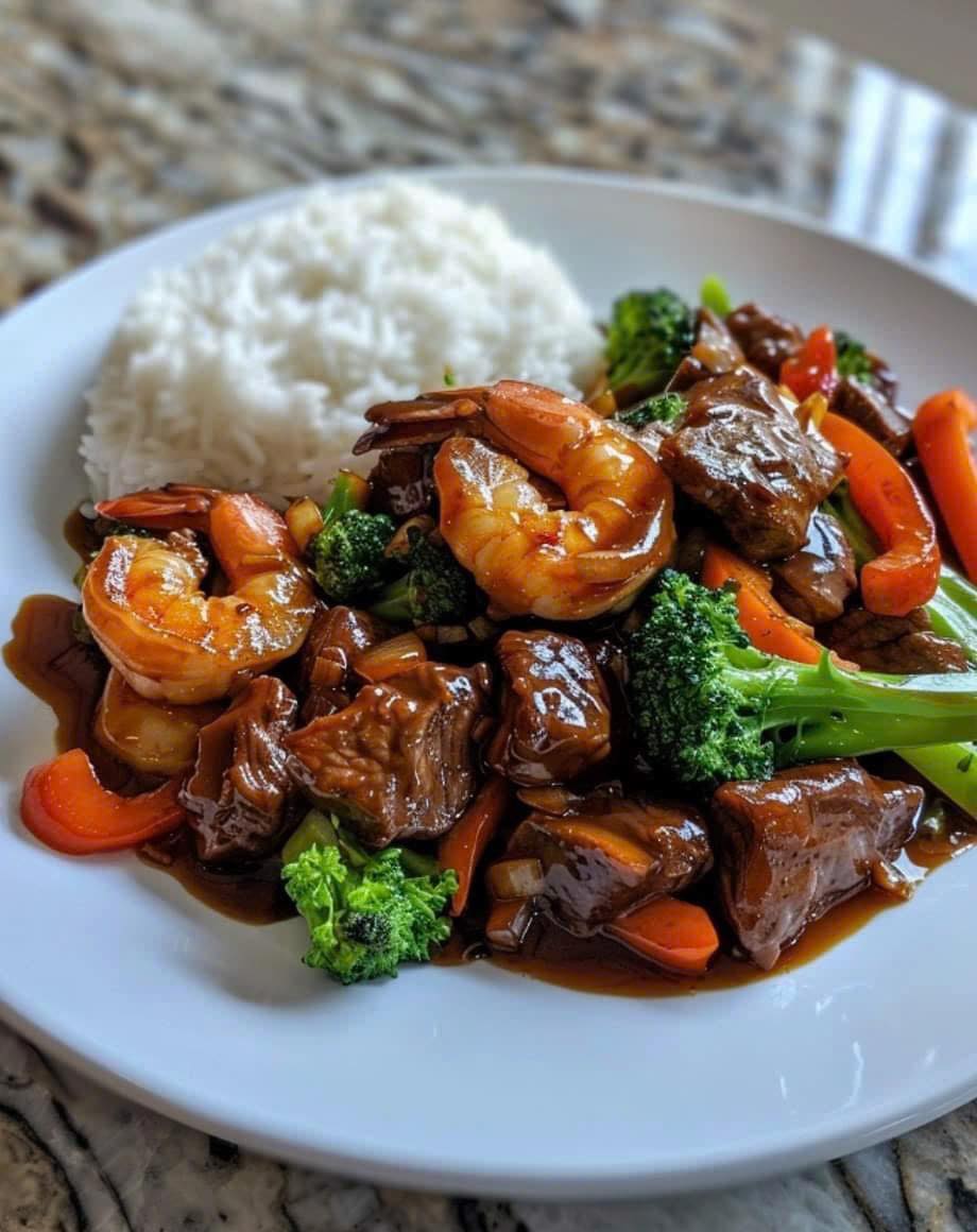 Ta wołowina i krewetki w glazurze hoisin z warzywami to żywa i aromatyczna potrawa, która łączy wołowinę i krewetki z słodką i pikantną glazurą hoisin. Dodatek świeżych warzyw sprawia, że jest to dobrze zbilansowany, pyszny posiłek idealny na szybką kolację w środku tygodnia.