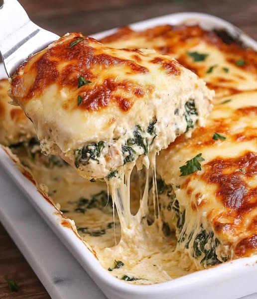 Zapiekanka z kurczakiem faszerowanym szpinakiem i serem w kremowym sosie to bogate, aromatyczne danie z soczystymi piersiami kurczaka nadziewanymi kremową mieszanką szpinaku, sera i czosnku. Idealnie upieczona, ta potrawa to idealne połączenie przyjemności i wartości odżywczych. Świetnie sprawdzi się jako pożywny obiad i dobrze komponuje się z pieczonymi warzywami, ryżem lub świeżą sałatką.